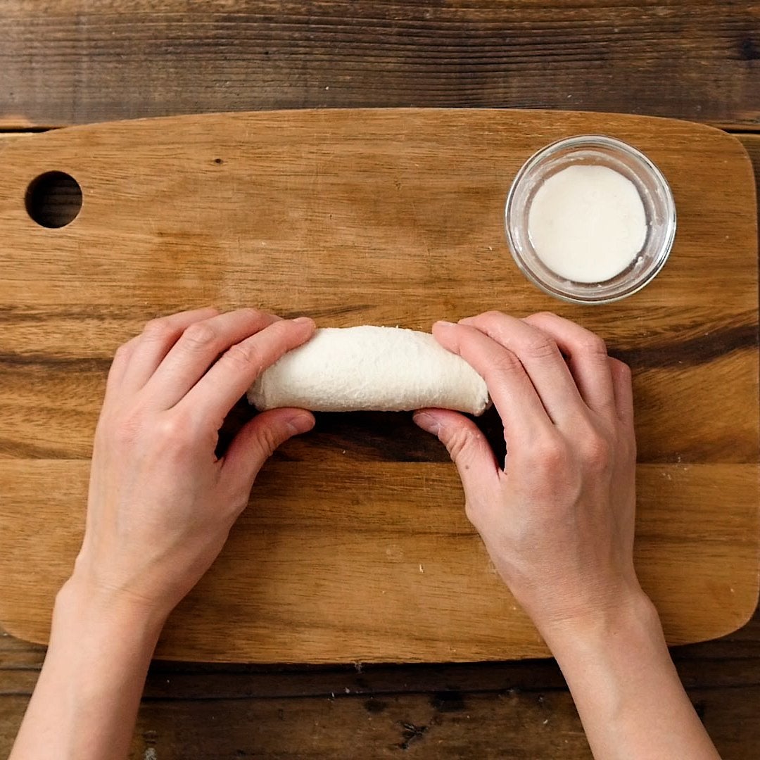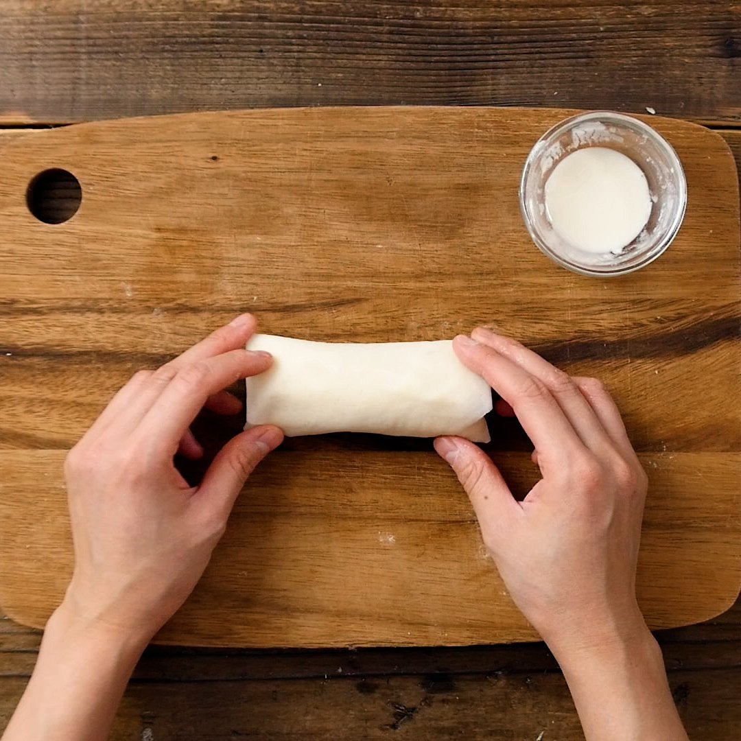 ②を適量のせて巻き上げて、水溶き小麦粉で止めます。