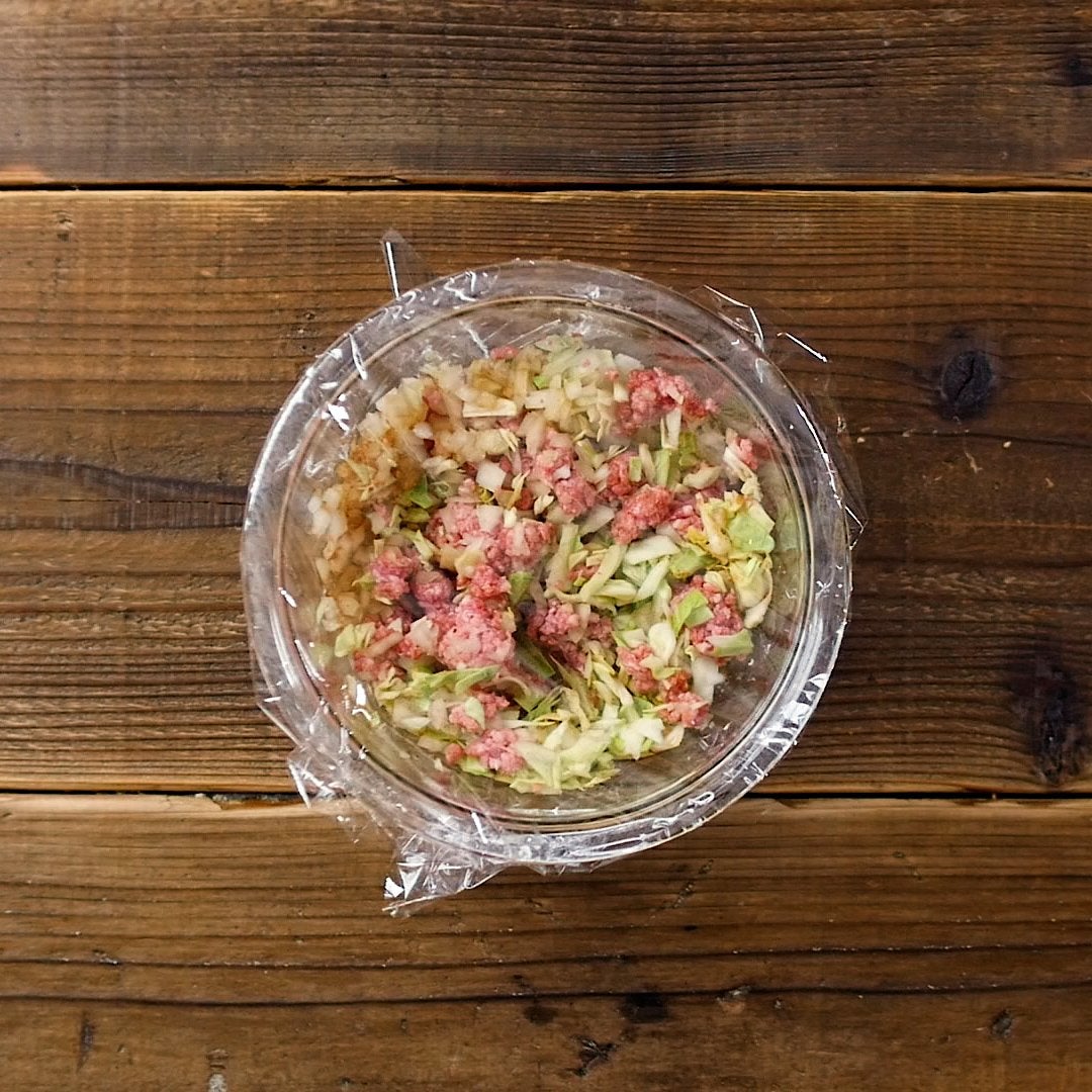 ボウルに 合いびき肉、キャベツ、玉ねぎ、(a) を混ぜ合わせ、レンジ600Wで4分加熱します。取り出して混ぜ合わせ、水溶き片栗粉を加えて、レンジ600Wで1分加熱します。