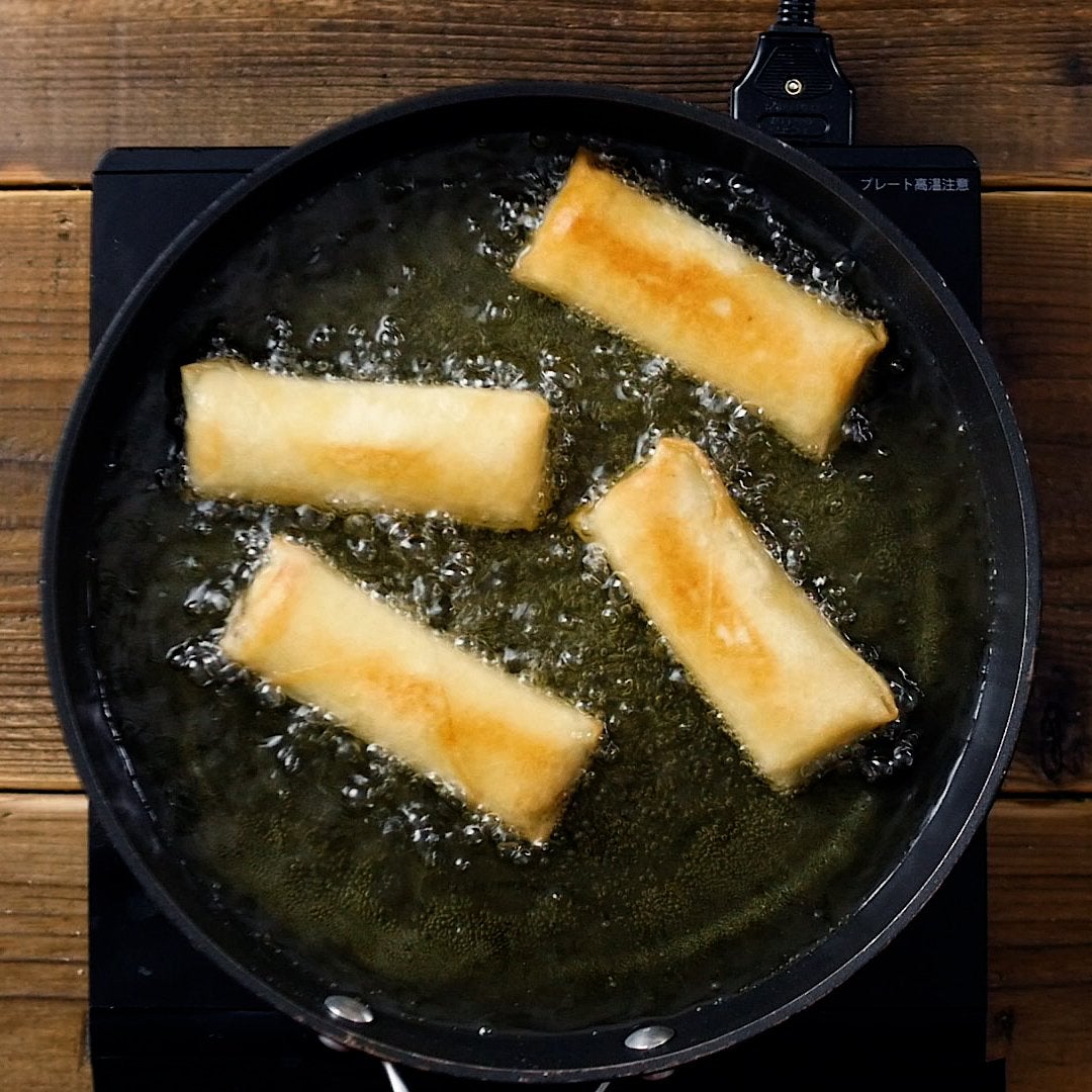 フライパンに170℃のサラダ油を入れて熱し、きつね色になるまで揚げて完成です。※同じ作業を繰り返します。