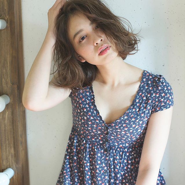 外ハネベースで細かく巻いたパーマ風のヘアスタイルには、伸ばしかけの前髪も細かい巻き方とアレンジで軽やかに。