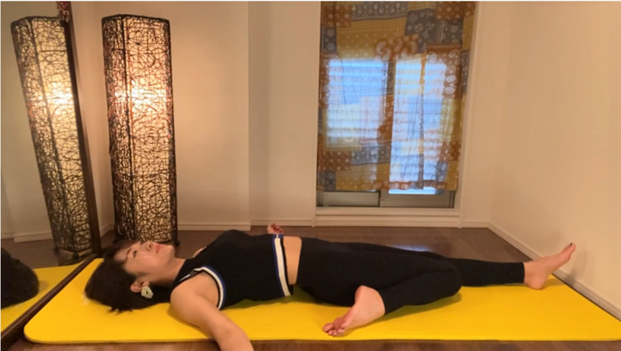1日の活動を終えた体の疲れと緊張をとるデトックスポーズ。お尻を揺らし、膣の力を抜くことで、背中を中心に全身の力が抜け、リラックスできます。