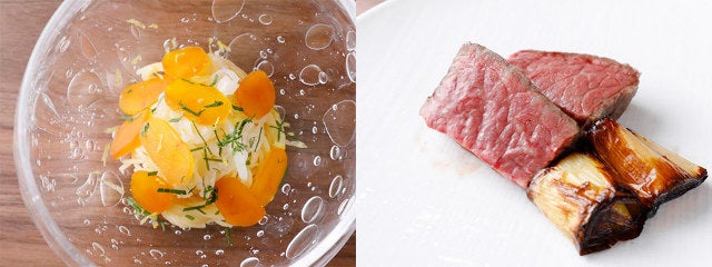 表面はこんがり、中は赤褐色に焼き上げた「黒毛和牛の炭火焼き」(写真上・右)の味付けは塩のみ。「ジュワッと湧いてくる肉汁がソースです」とのシェフの言葉に思わず唸らされる。