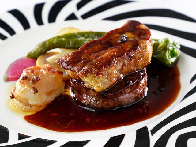 もうひとつの人気メニュー「ハンガリー産フォアグラのポワレ 旬の野菜とその日のソース」(写真上・右)は、シェフの気まぐれソースを楽しめるというオツな一品。マデラソース、ポルトソース、コンソメソース、プルーンのソースなどさまざまな味で登場するので、何度オーダーしても新鮮な喜びを味わえる。