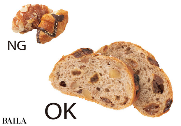食品を選ぶならかたくてずっしりしたものを。「食パンやシュークリーム、バラ肉など、ふんわり・サクサク・やわらか食感のものは油脂や砂糖などが多く高カロリー。全粒粉パンや、ヒレ肉などかたくて重いものは水分や食物繊維が多く低カロリーです」