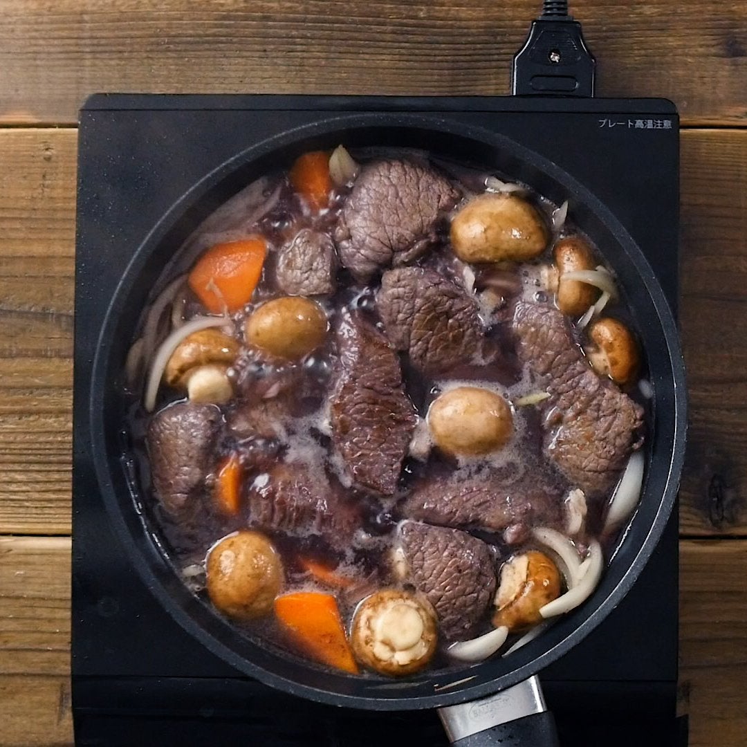 肉を鍋に戻し、①の赤ワイン、水を加え、ひと煮立ちしたらアクを取り除きます。