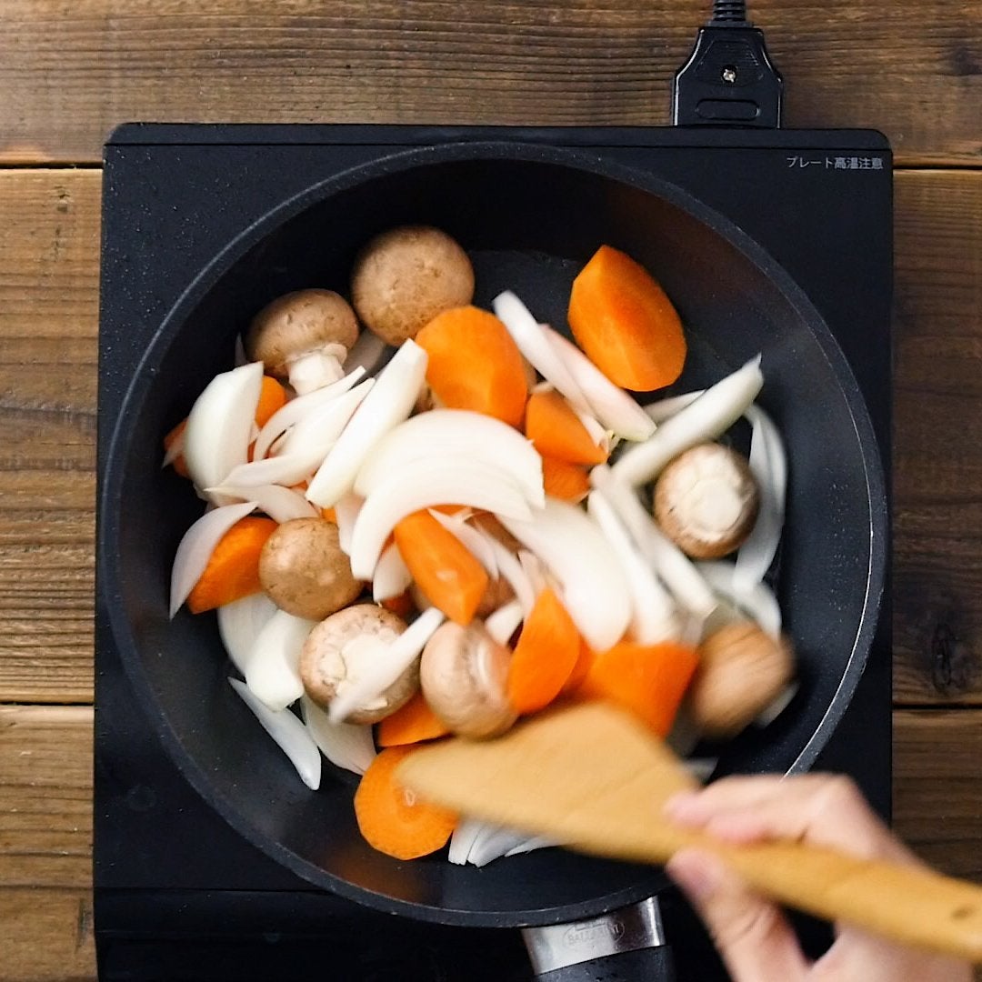 肉を取り出し、余分な油を拭いて、サラダ油(大さじ1/2杯)、玉ねぎ、にんじん、マッシュルームを加えて炒め合わせます。