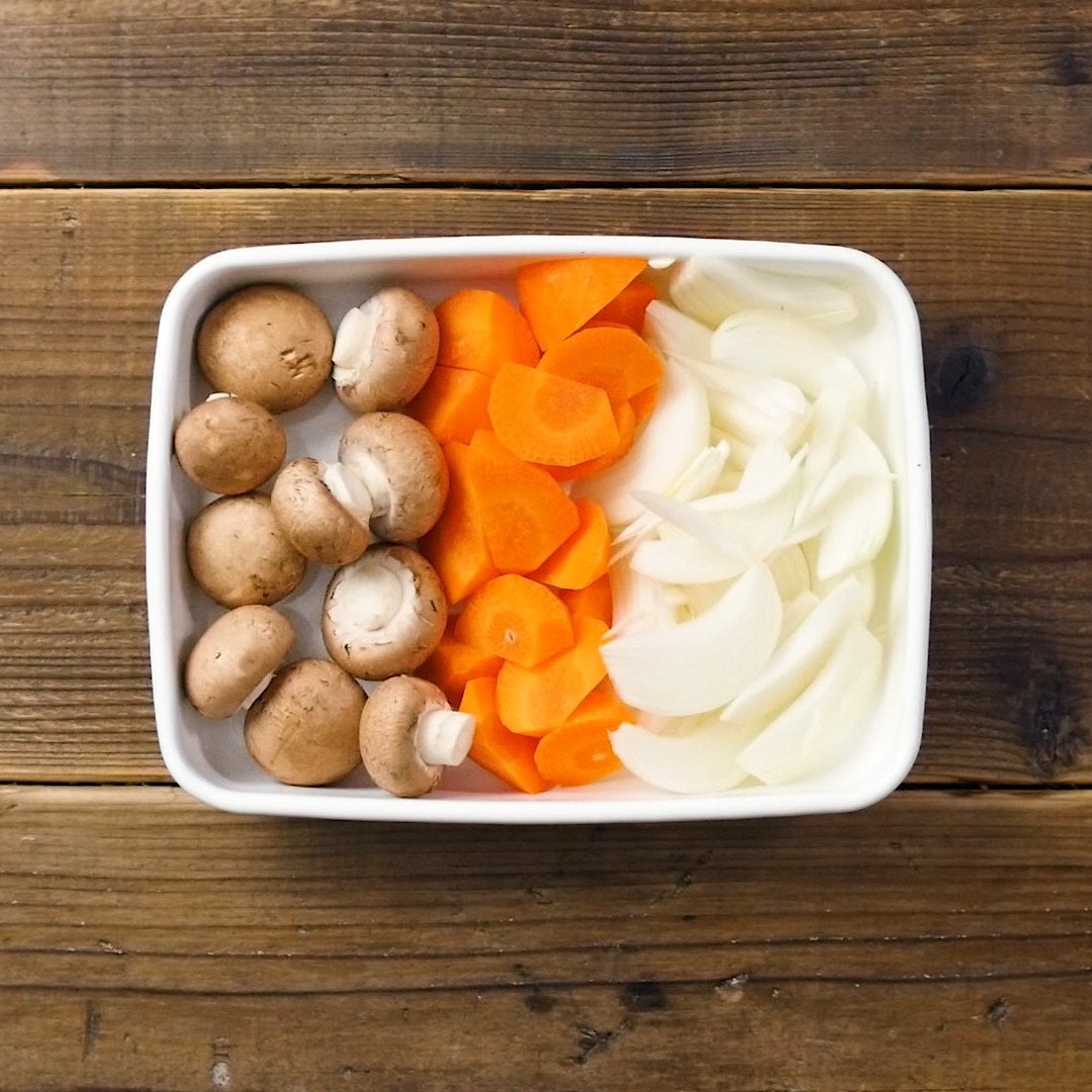 玉ねぎは2㎝幅のくし切りにし、にんじんは大きめの乱切りにします。マッシュルームは石づきを取り除きます。
