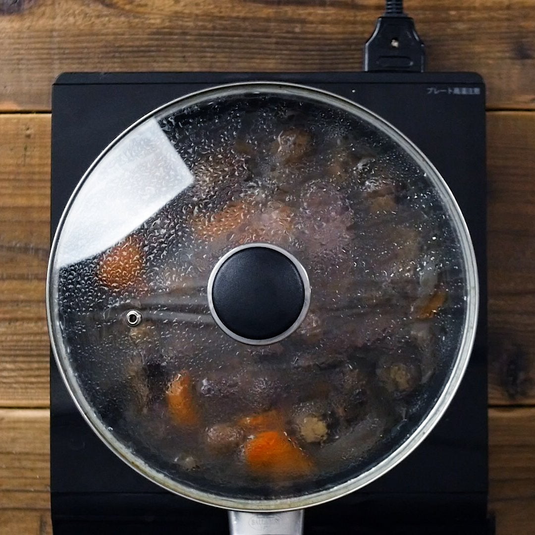 フタをしめ、弱火で2時間煮込みます。