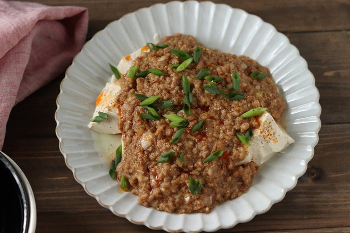 ぷるぷる豆腐に、旨辛の肉味噌をたっぷりとかけてご飯と一緒に召し上がれ♪ レンジで作ったとは思えないおいしさで、お箸が止まらなくなります!