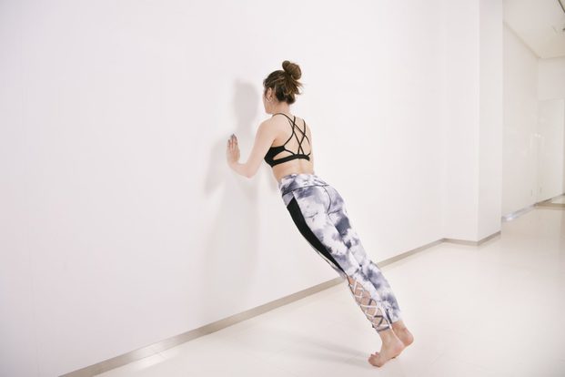 壁を使って腕立て運動をします。こちらも二の腕や胸の筋肉に効いているのがすぐ感じられる少々キツめのエクササイズです。