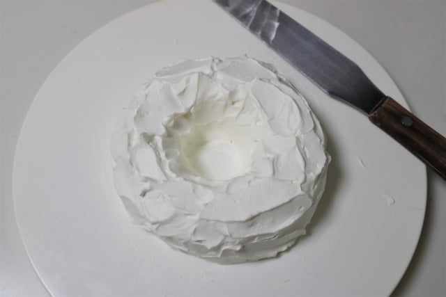 ⑩ ケーキにパレットナイフ(無ければスプーン)でクリームをペタペタ塗っていく。