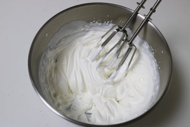 ② 卵白のボウルに残りの砂糖を加え、ハンドミキサーでツノが立つまで泡立てメレンゲを作る。