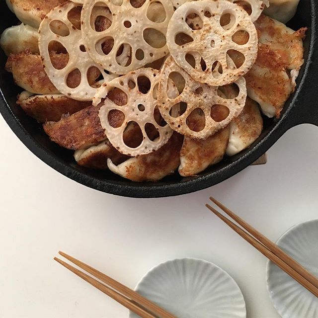 スキレットレシピはこれ♪鉄鍋餃子の蓮根のせ
