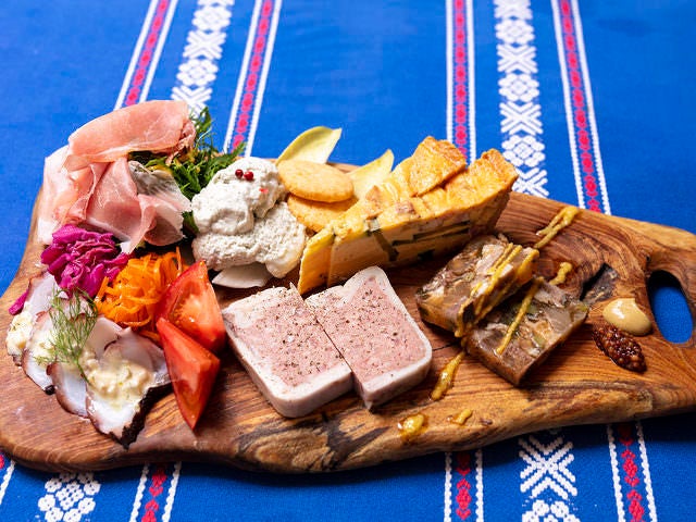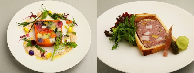 猪口シェフの故郷から届く猪肉が主役の「熊本天草産猪肉のパテ・アンクルート」(写真上・右)は、豚トロやピスタチオをアクセントに取り入れた一品。食感が豊かでワインが進むこと請け合いだ。
