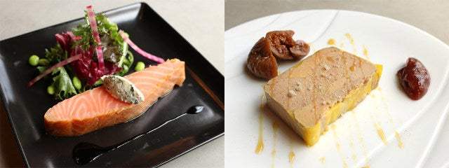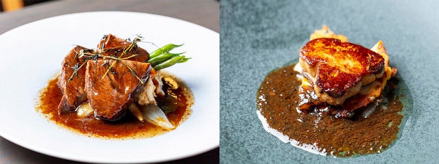 塩とグランマニエでマリネしたテリーヌが主役の「フォアグラのテリーヌ ドライイチジクのコンポートと黒イチジクのコンチチュール」(写真上・右)も定番人気。シナモン、八角、ラム酒で作ったシロップに浸したドライイチジクのコンポート、フレッシュな生イチジクで作ったコンフィチュールが添えられているので、イチジクとのマリアージュ、2種のイチジクの食べ比べも楽しい。
