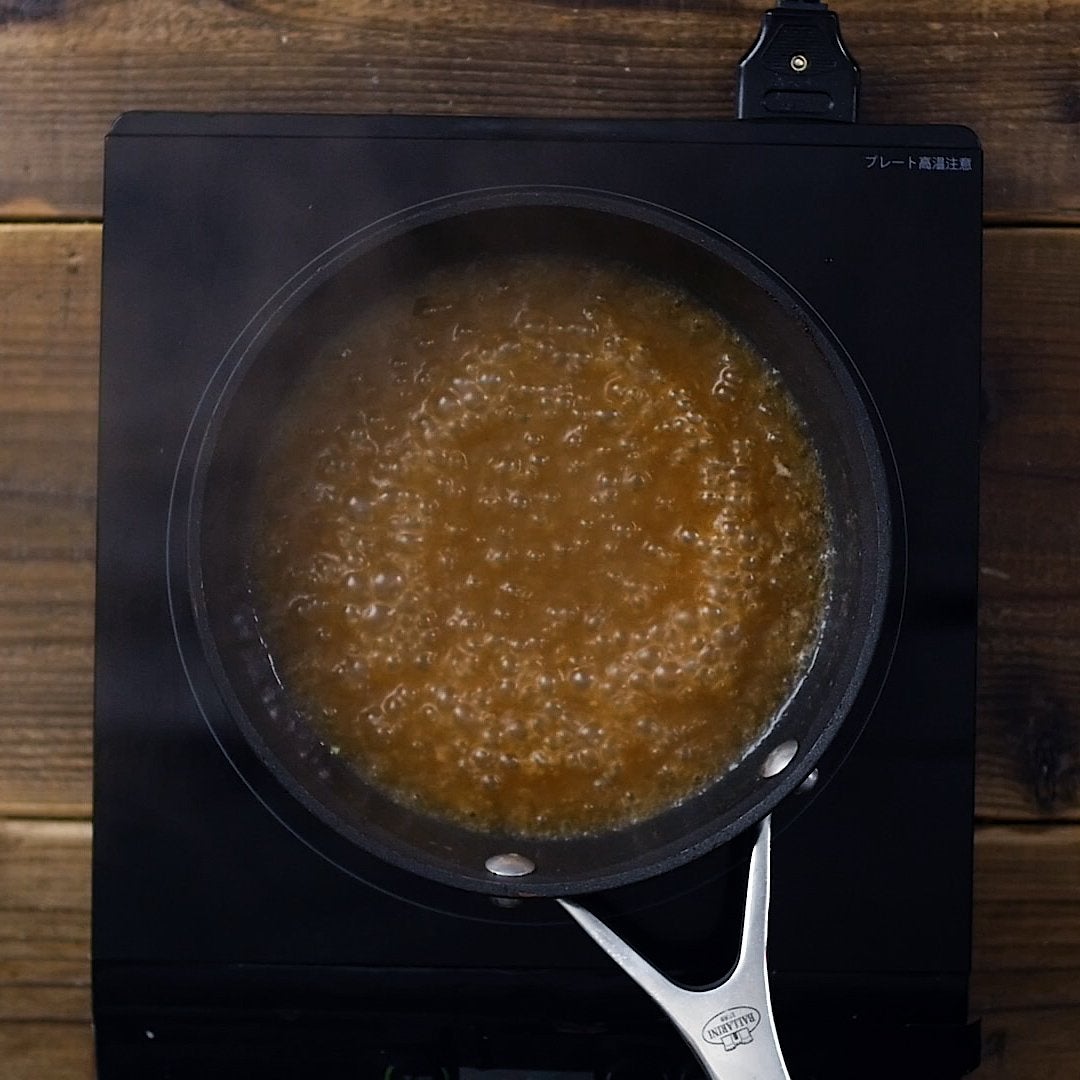 ②のフライパンに玉ねぎのすりおろしと (a) の調味料を入れて火にかけ、ひと煮立ちしたら弱火で5分ほど煮詰めます。