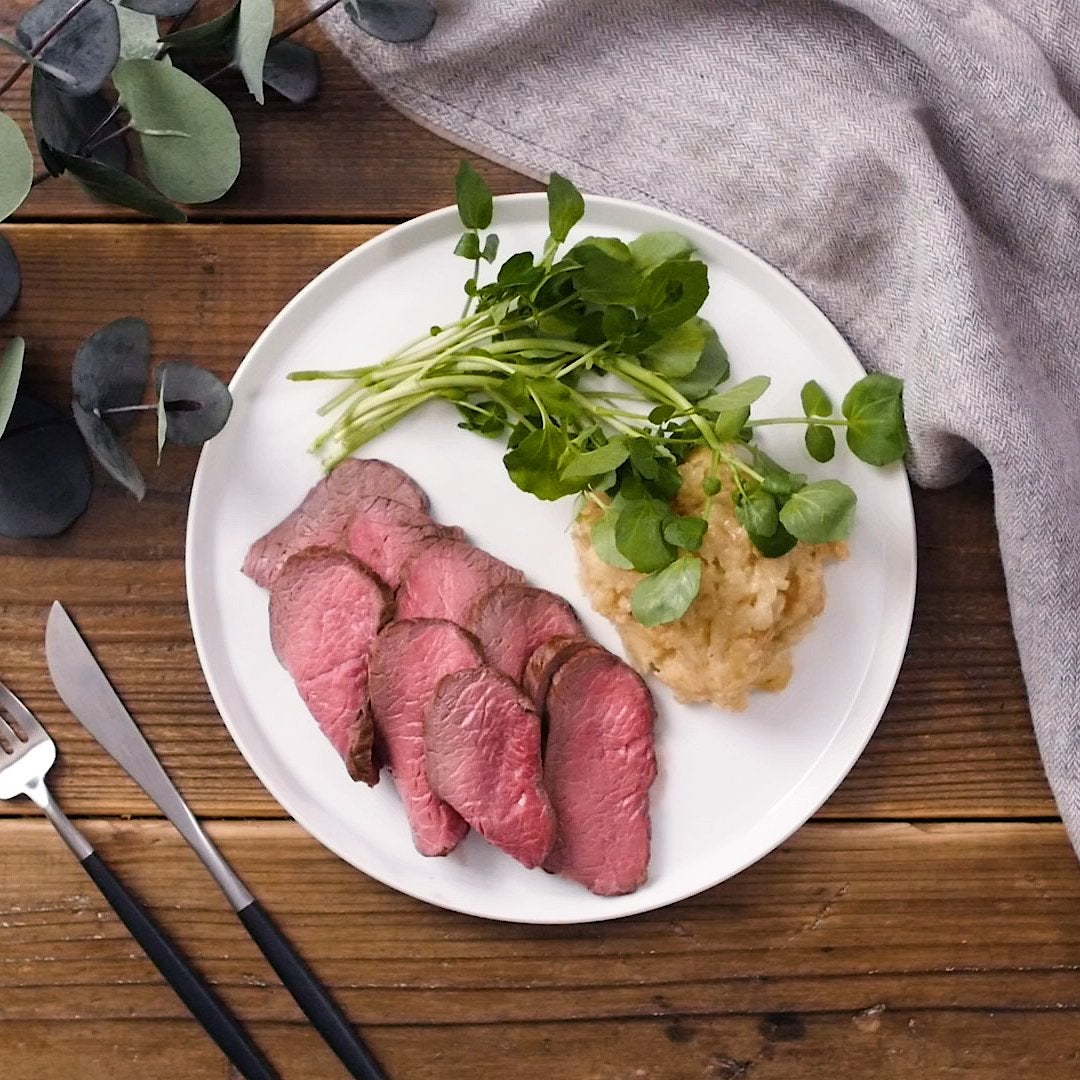 ・牛もも肉(ブロック) … 300g・塩 … 小さじ1/3杯・こしょう … 少々・オリーブオイル … 大さじ1杯ソース・玉ねぎ … 1/2個・a. 酒 … 大さじ3杯・a. みりん … 大さじ3杯・a. しょうゆ … 大さじ1杯・a. 砂糖 … 小さじ2杯トッピング・クレソン … 適量・マッシュポテト … 適量【下ごしらえ】ローストビーフ