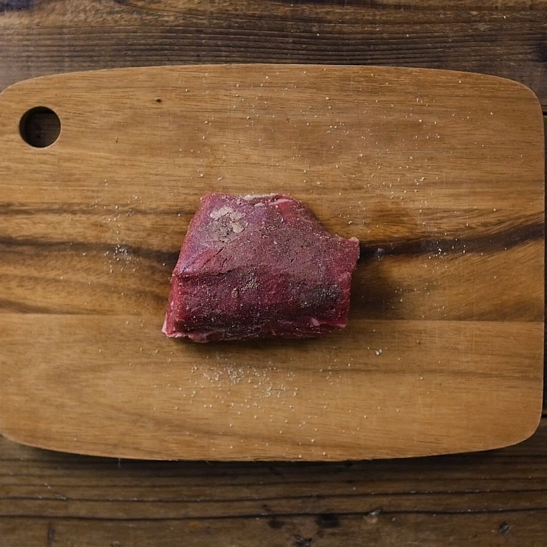 牛肉はフォークで数か所刺し、塩こしょうをすり込みます。