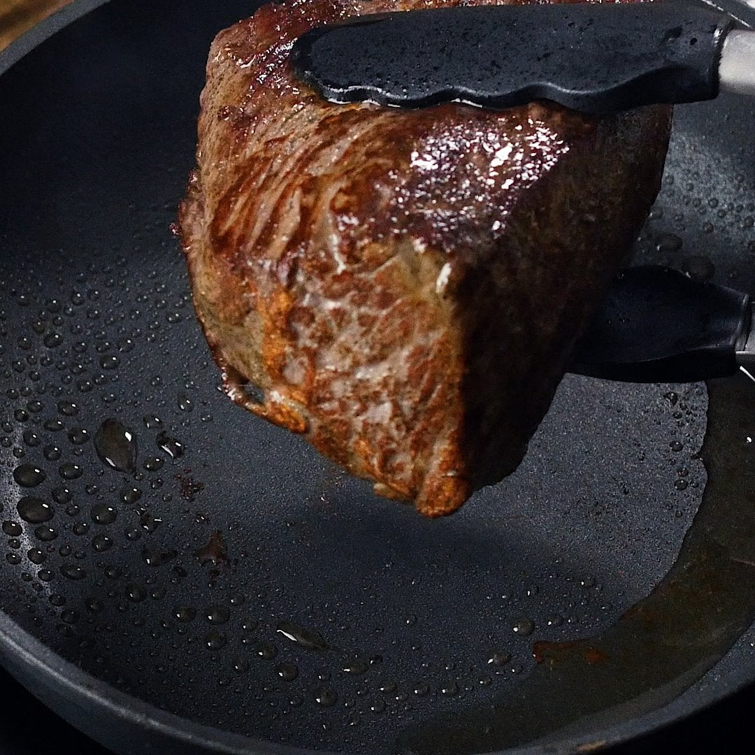 フライパンにオリーブオイルを引いて強火にかけます。フライパンがしっかり熱されたら①を入れて1面1分ずつ焼いて、全面に焼き色をつけて取り出します。