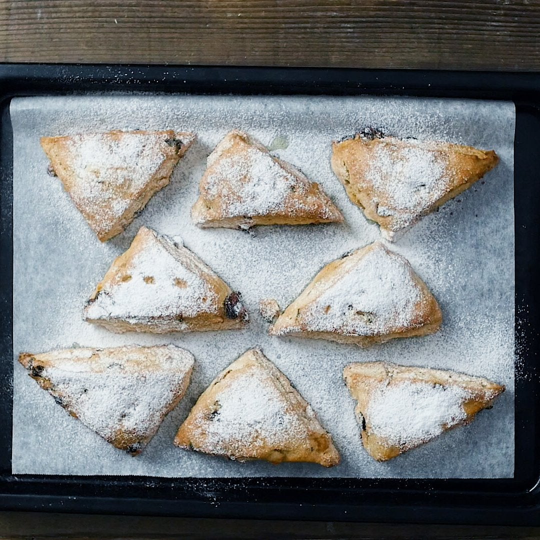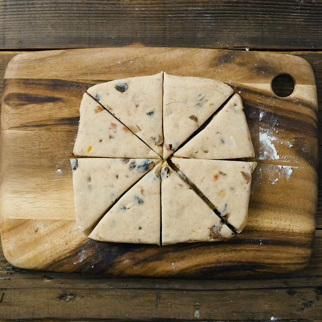 ・薄力粉 … 210g・アーモンドプードル … 40g・ベーキングパウダー … 小さじ2杯・グラニュー糖 … 30g・シナモンパウダー … 少々・牛乳 … 100cc・ラム酒 … 大さじ1/2杯・ドライフルーツ … 80g・ミックスナッツ … 20g・バター(無塩) … 70gトッピング・バター(無塩) … 20g・粉砂糖 … 適量【下ごしらえ】シュトーレン風スコーン