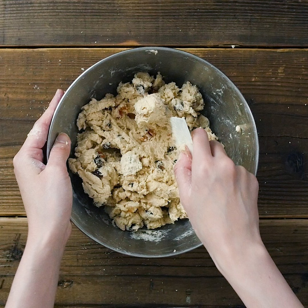 バターがなじんだら、ドライフルーツ、ミックスナッツ、牛乳、ラム酒を加え、こねないように生地をまとめます。