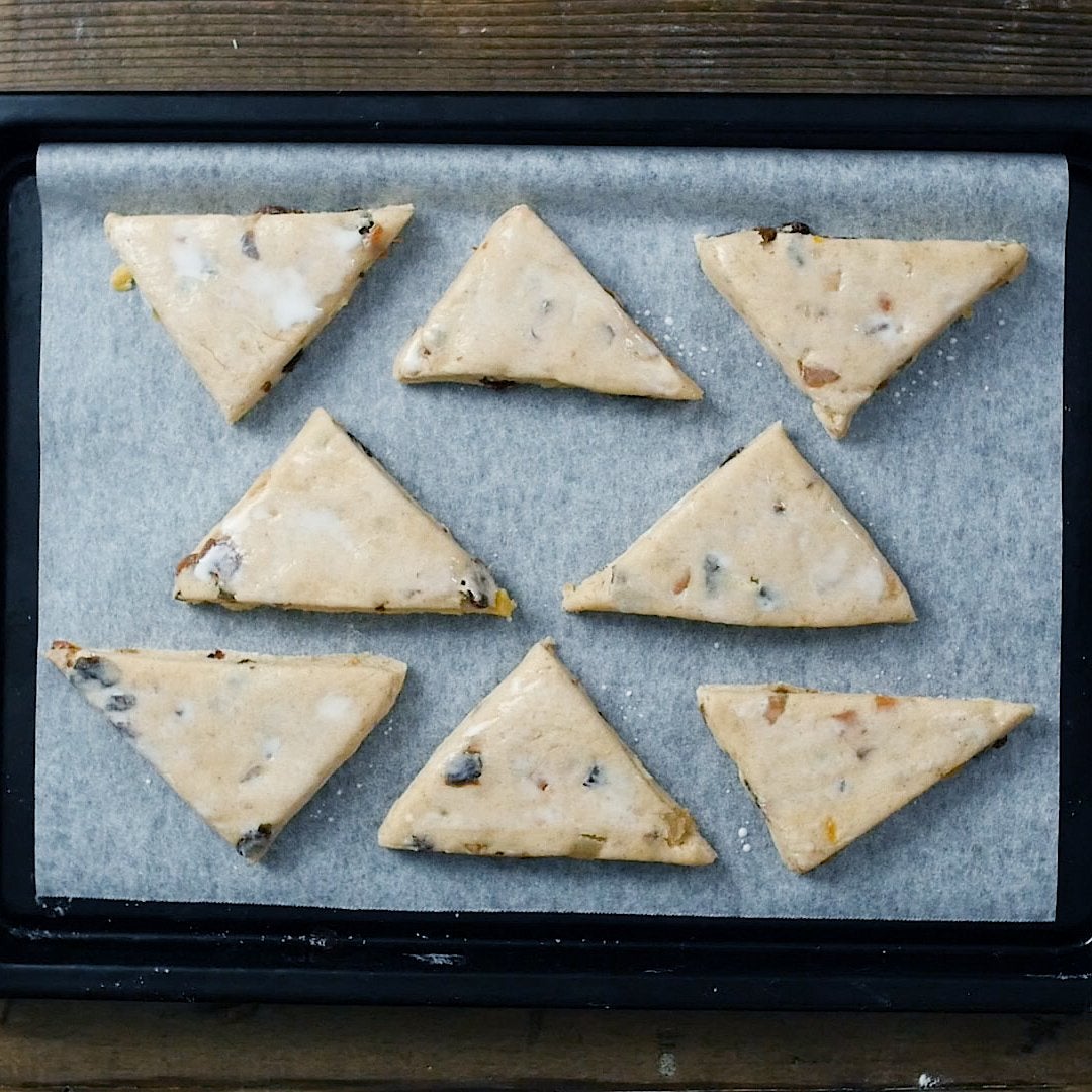 クッキングシートを敷いた天板の上に並べ、刷毛で牛乳(分量外)を塗ります。