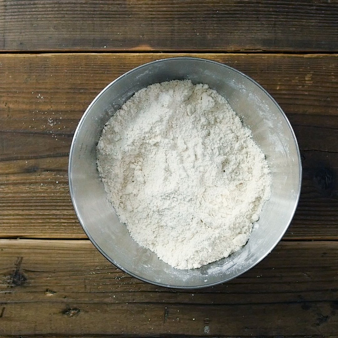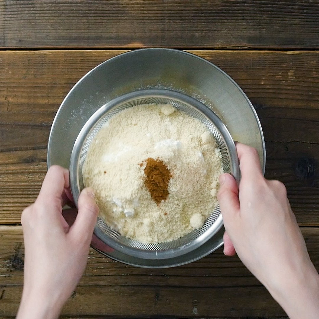 ボウルに砂糖、バターを入れ、薄力粉、ベーキングパウダー、アーモンドプードル、シナモンパウダーをふるい入れます。