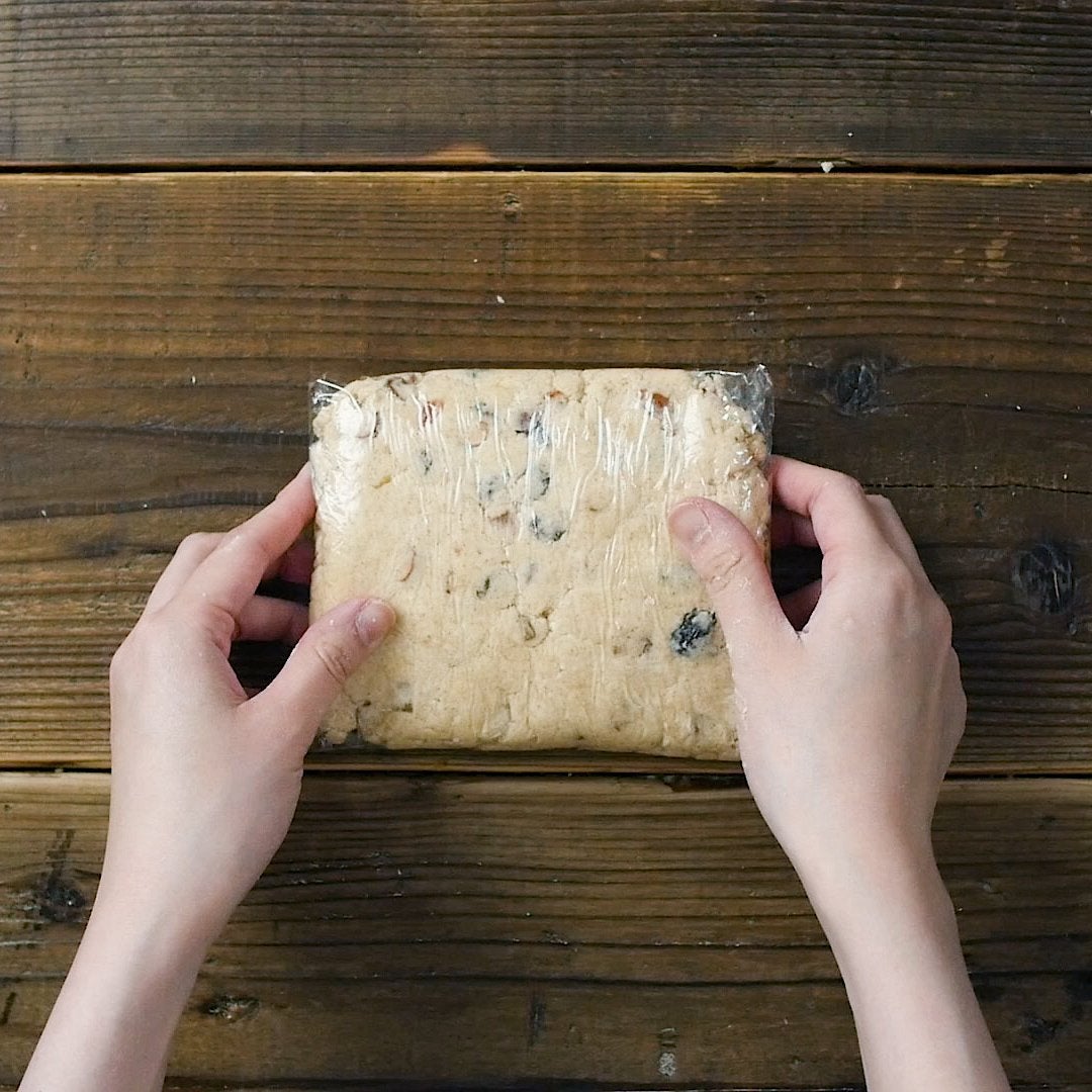 ひとまとめにしたらラップで包み、冷蔵庫で15〜20分休ませます。