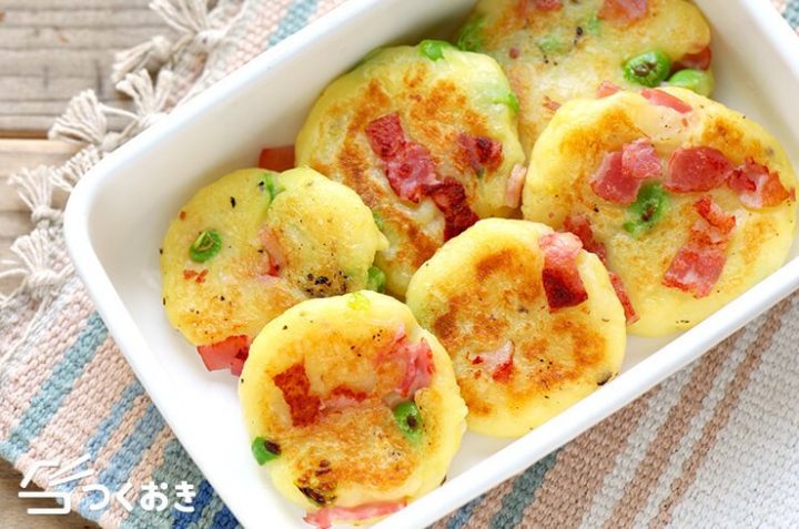 こちらはじゃがいも餅のアレンジバージョン。子供が好きなベーコンや枝豆を生地に混ぜ込んで作る、朝ごはんにおすすめのレシピです。