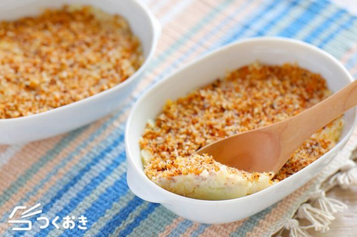 マッシュポテトと千切りのじゃがいも、2種類のじゃがいもを重ねてツナやマヨネーズ、チーズなどと一緒にオーブンで焼き上げる人気のレシピです。