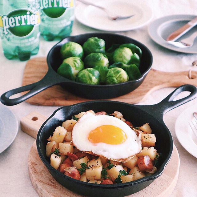 スキレットで作るソーセージハッシュは、朝ごはんのおかずにぴったりの人気レシピです。角切りにしたじゃがいもをスキレットで炒め煮にしていきます。