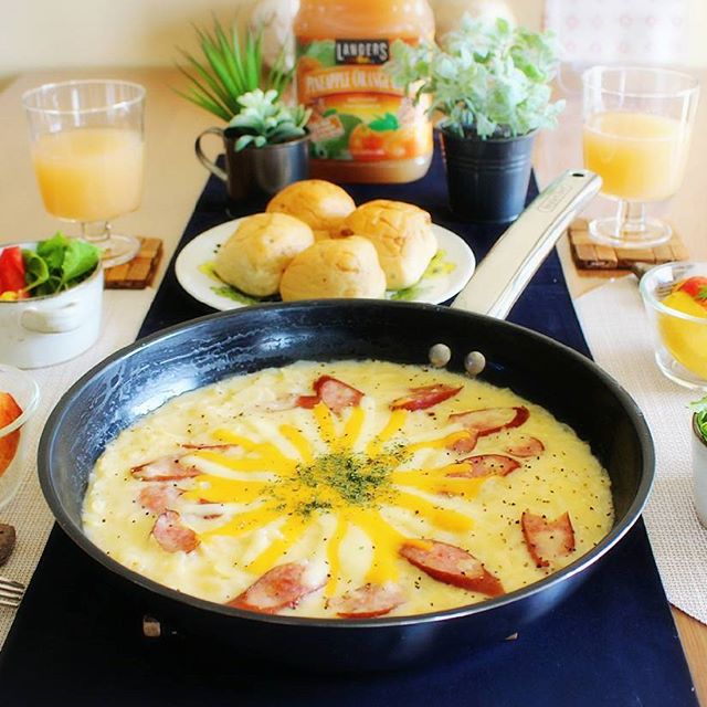 フライパンで焼いて仕上げたら、そのままテーブルに並べると豪華に見えます。ゆっくり過ごしたい休日の朝ごはんにおすすめです。