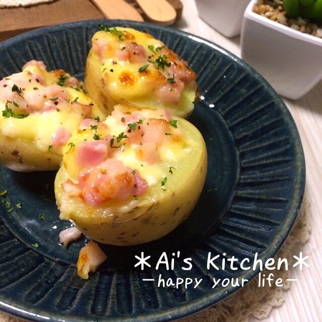 じゃがいもはレンジで加熱して柔らかくしておき、切り口にベーコンやチーズ、マヨネーズなどをのせてトースターで焼くだけ。