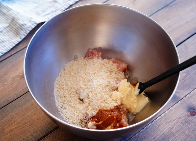 ① ボウルに〇の材料を入れて、粘りが出るまで混ぜ、たねをボウルに打ち付けて空気を抜いてひと固まりにする。オーブン用のシートを敷いた天板に乗せ、厚さ3cm、大きさ15cm×13cmくらいの長方形を作る。(ひき肉のたねが緩い時はパン粉を増やして調整して下さいね。)