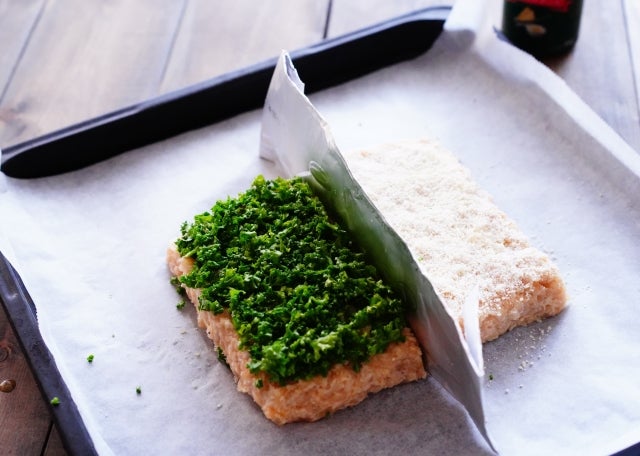 ② アルミホイルなどでたねを中央から2等分にし、パセリと粉チーズを半分ずつ乗せて軽く押さえてなじませる。