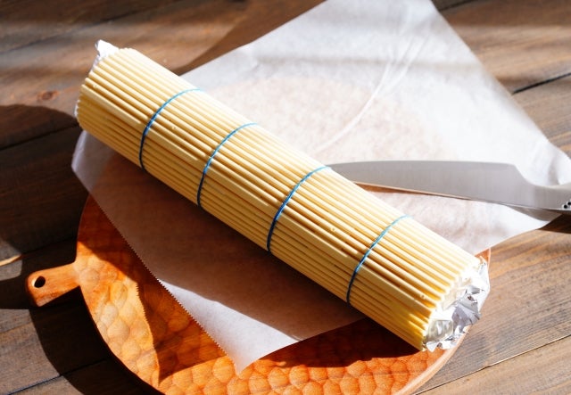 ④ しっかりと巻いて、巻き終わりを下にして輪ゴムなどで止めて30分程置いてそのまま冷ましたらシートから外しカットして盛り付ける。