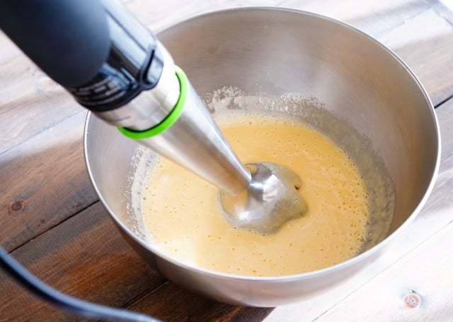 ① 大きめのボウルに溶き卵、潰したはんぺん、砂糖、みりん、塩を入れて泡立て器でよく混ぜる。(フードプロセッサーやブレンダーをお持ちの方はそちらを使った方がラクチンで綺麗に出来ます。)