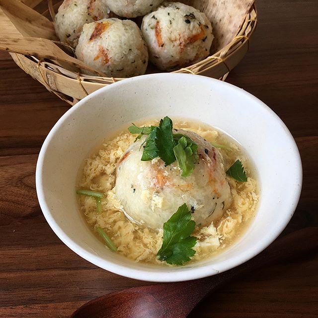 こちらはおにぎりに和風の卵あんかけをかけていただく、ちょっぴり豪華で上品なメニュー。おもてなし料理でも喜ばれそうな素敵な一皿です。