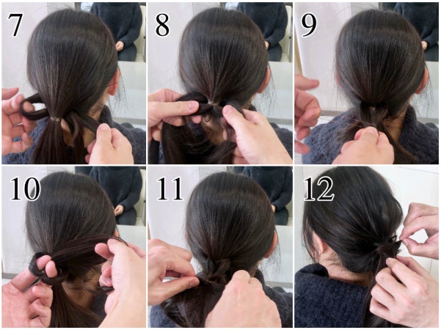 ⑦⑧ 両サイドの髪の毛を通したら、ゴムを根元によせます。
