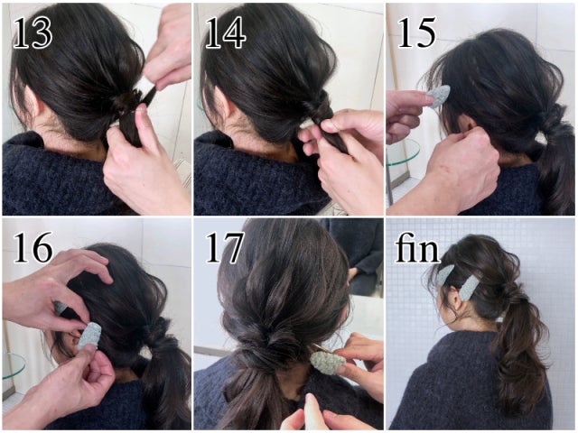 ⑬⑭ 毛先を使ってゴムを隠します。