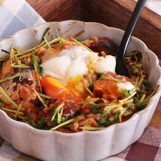 キムチやチーズと一緒にトースターでこんがり焼いて仕上げます。