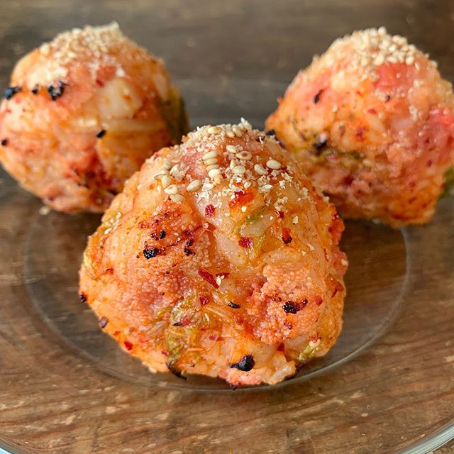 おつまみや副菜のような雰囲気でいただくことができます。ご飯にキムチや明太子を混ぜ込んでしっかり握り、香ばしく焼いていきます。