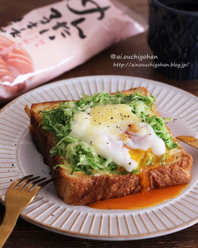 このレシピは食パンに千切りのキャベツを山盛り乗せた、朝ごはんにおすすめの料理です。