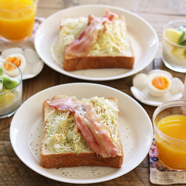 朝ごはんにキャベツトーストのベーコン乗せ