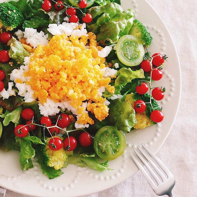 グリーンの野菜やトマトなどを盛り付けたあとに、刻んだ卵を花のように盛り付ければ出来上がり。