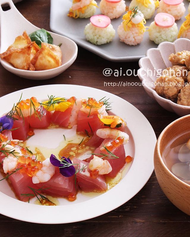 ひな祭りの献立におすすめしたい、まぐろのカルパッチョ。赤いまぐろで作るカルパッチョは華やかな雰囲気で、ひな祭りにぴったりです。