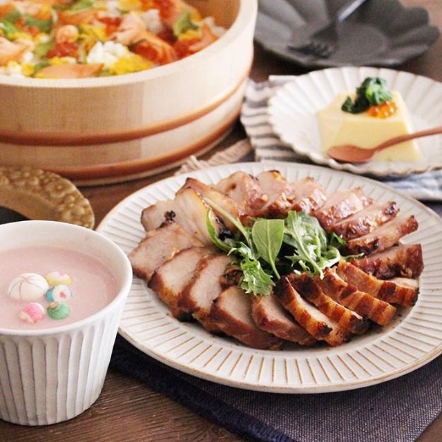 ひな祭りのごちそうメニューには、チャーシューがおすすめです。ちらし寿司やお吸い物などの料理とも相性が良く、どんな献立にも合わせやすいです。