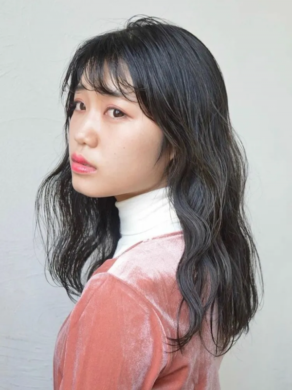 黒髪風のヘアカラーでヘアスタイルが重ためなので、前髪はシースルーバングを合わせてバランス良く仕上がっています。