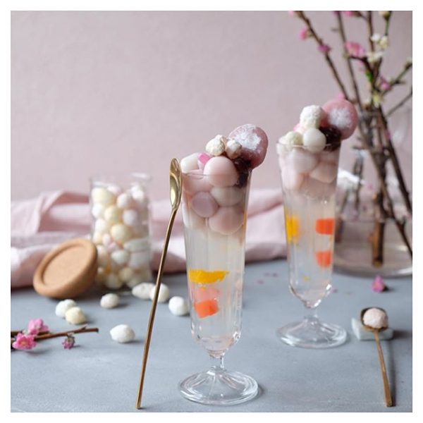 おしゃれなひな祭りに!桃色白玉あんみつ