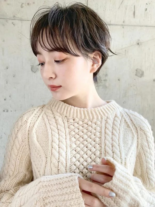 こちらのような黒髪に近いダークトーンのヘアカラーとの相性は抜群で、よりこなれた雰囲気のショートの髪型に変身。